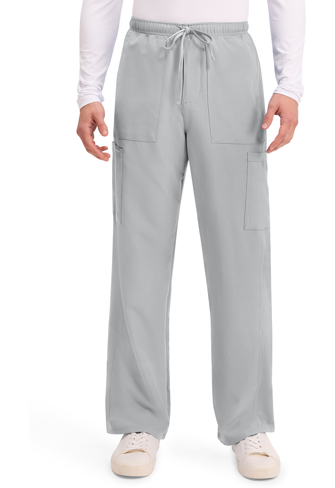 A true Men’s fit pant with zipper fly, this style offers lots of pockets and functional styling. The mid rise elastic-reinforced waistband includes a drawstring for adjustability. There are six pockets for organized storage: two side entry patch pockets, two cargo pockets with pen/instrument slots, and two back patch pockets. The cargo pockets and back pockets have reverse hem trim for added detailing. Forward leg seams provide leg-lengthening style. Decorative tonal topstitching finishes this style. Straight leg, 19″ opening. Inseam: 35″