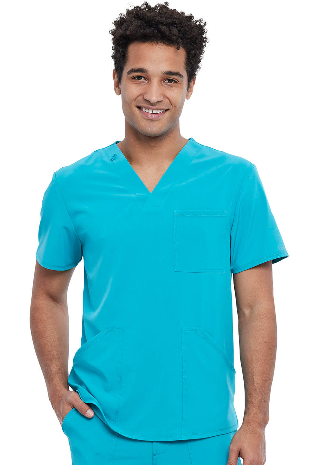 This Men’s Modern fit V-neck top has a bungee ID badge loop at the neck and a back yoke seam. There are three pockets: one chest pocket and two front patch pockets. Side vents give this top ease of movement. Center back length: 28″