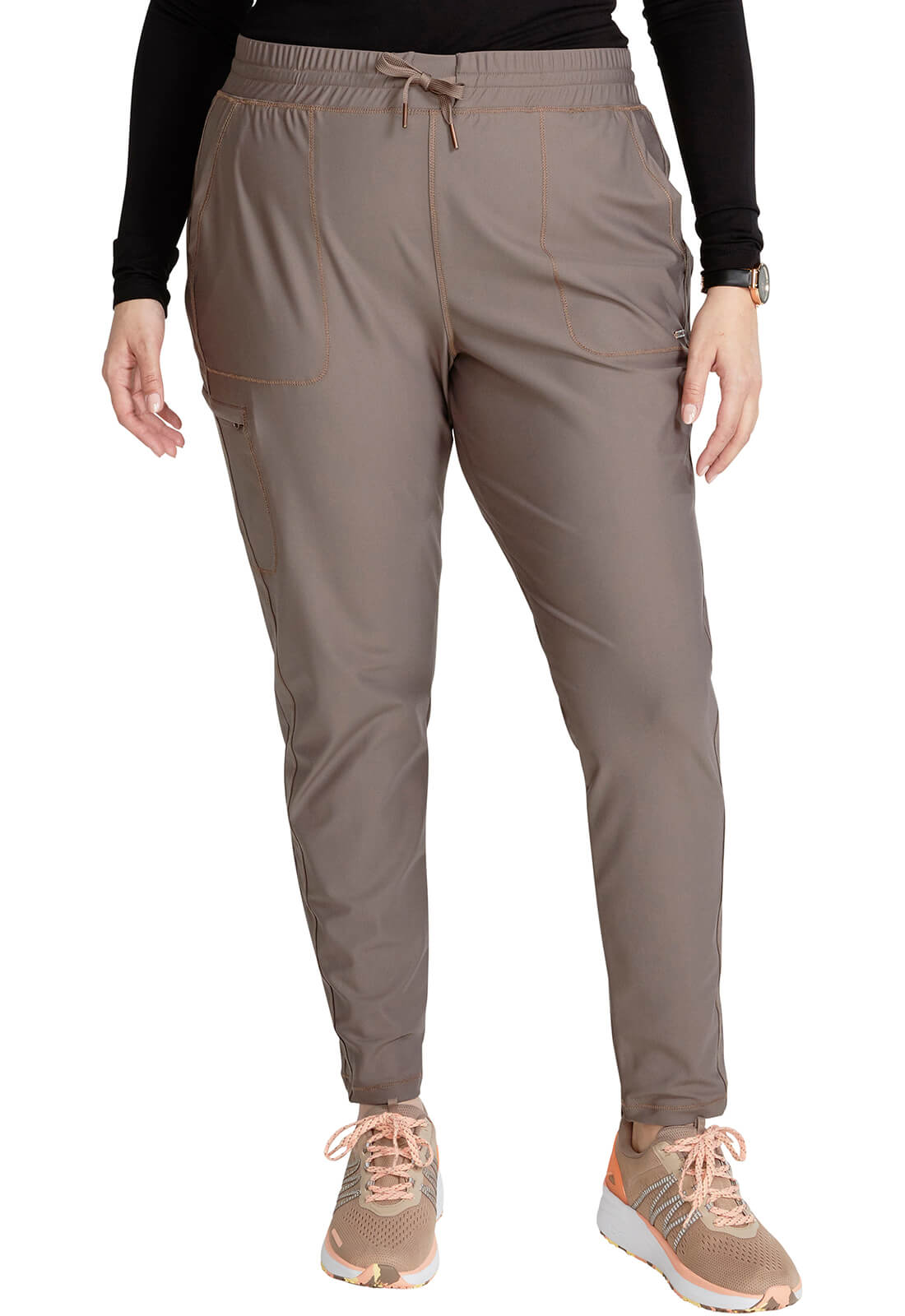 This Contemporary fit mid rise pant has a multi-needle stitched elastic encased waistband with drawstring. Drawstring includes antique copper-colored tips. There are five pockets in total: two front angled pockets, one zip cargo pocket and two zip back patch pockets. Tapered leg, 9 1/2″ opening. Inseam length: 29″
