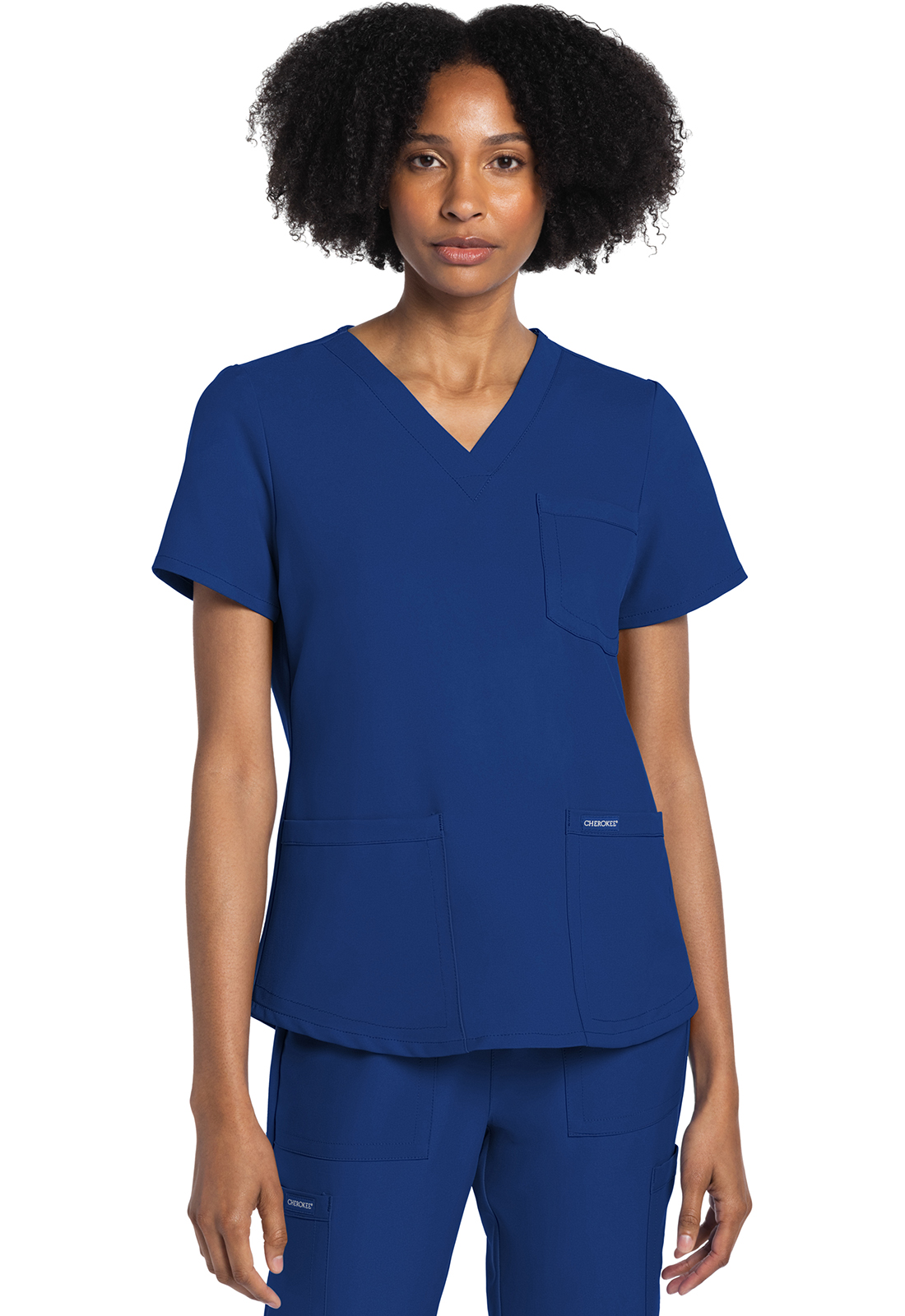 A v-neck top with shirttail hem elevates this style beyond a basic v-neck. There are a total of three pockets with reverse hem trim: a chest patch pocket and two roomy patch pockets. Decorative tonal topstitching adds the finishing touch to this scrub top. Modern Classic fit. Center back length: 26″